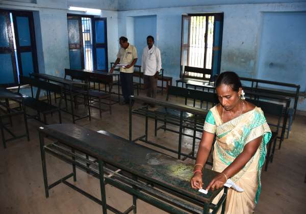 பத்தாம் வகுப்பு அரசு பொதுத்தேர்வு நாளை தொடங்குவதை ஒட்டி கடலூர் மஞ்சக்குப்பம் மாநகராட்சி அரசு ஆண்கள் மேல்நிலைப்பள்ளியில் மேஜையில் தேர்வு எண் ஒட்டும் பணி நடைபெற்று வருகிறது.