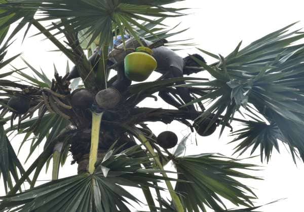 பதநீர் சீசன் துவங்கியுள்ள நிலையில் விற்பனைக்காக பனை மரத்தில் ஏறி பதநீர் இறக்கும் பணியில் ஈடுபட்டுள்ள தொழிலாளி.இடம்: குலசேகரன்பட்டினம், தூத்துக்குடி மாவட்டம்.