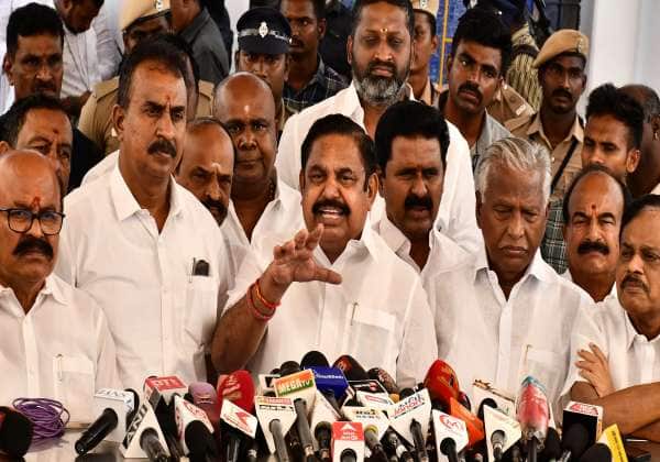 சென்னை தலைமைச் செயலகத்தில் பத்திரிகையாளர்களுக்கு பேட்டி அளித்த எதிர்க்கட்சித் தலைவர் பழனிசாமி உடன் எம்.எல்.ஏக்கள்.