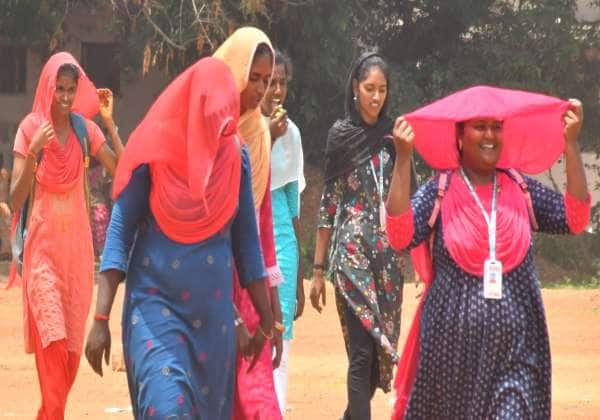 கோடை வெயிலின் தாக்கம் அதிகமாக இருந்ததால் கல்லூரி மாணவிகள் தலையில் துப்பட்டாவுடன் சென்றனர். இடம்: சிவகங்கை மகளிர் கல்லூரி ரோடு.