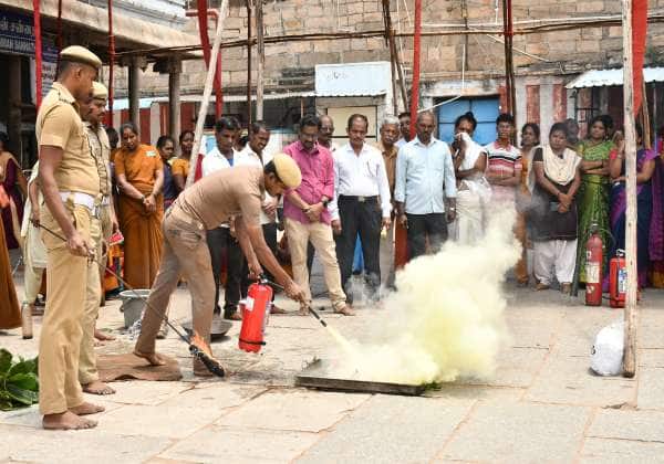 சென்னை திருவொற்றியூர் தியாகராஜ வடிவுடையம்மன் கோவிலில் தீயணைப்பு வீரர்கள் விழிப்புணர்வு ஒத்திகை நடத்தினர்.