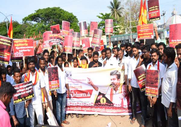 விழுப்புரம் புது பஸ் நிலையம் அருகே நகராட்சி திடலில் தமிழக வெற்றி கழகம் சார்பில் ஆர்ப்பாட்டம் நடந்தது