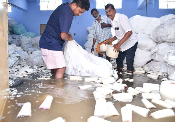 திருப்பூர், சுற்றுப்பகுதிகளில் நள்ளிரவில் பெய்த கனமழையால் கொங்கு மெயின் ரோடு, திருநீலகண்டபுரத்தில் உள்ள நூல் குடோனில் மழைநீர் புகுந்தது.
