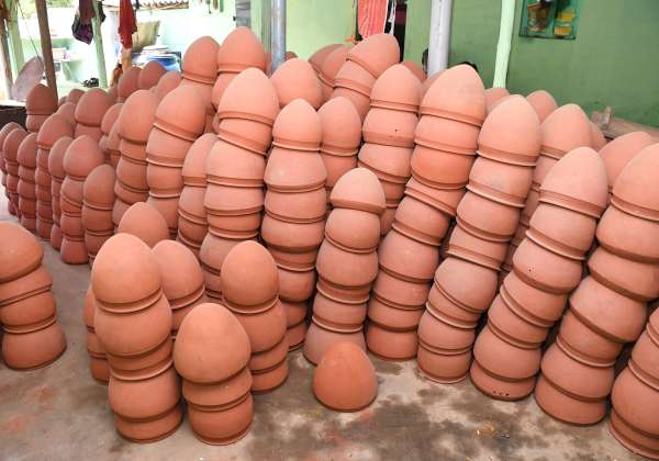 உடுமலை மாரியம்மன் கோவில் திருவிழாவிற்காக விற்பனை செய்ய களிமண்ணால் செய்து அடுக்கி வைக்கப்பட்டுள்ள பூவோடுகள்.
