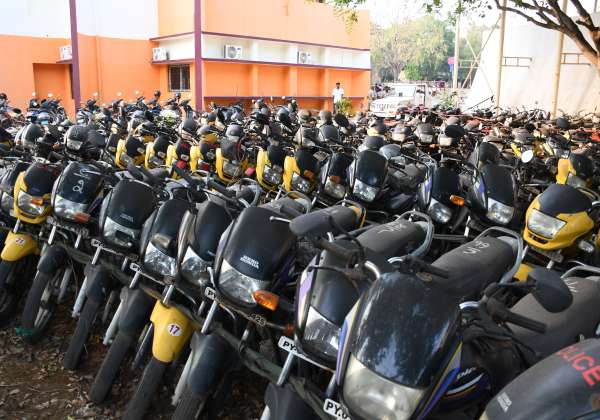 புதுச்சேரி காவல்துறை அதிகாரிகள் பயன்படுத்திய மோட்டார் சைக்கிள் போலீஸ் விளையாட்டு மைதானத்தில் வீணாக நிறுத்தி வைக்கப்பட்டுள்ளது