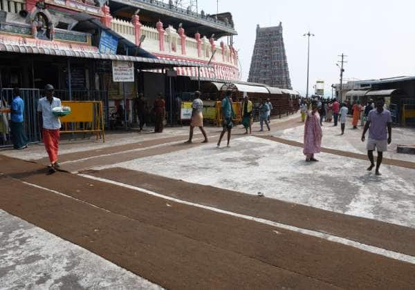 திருவள்ளூர் மாவட்டம் திருத்தணி முருகர் கோவிலில் பக்தர்கள் வசதிக்காக கொளுத்தும் வெயிலுக்கு இதமாக தேங்காய் நார் கம்பளம் அமைக்கப்பட்டுள்ளது