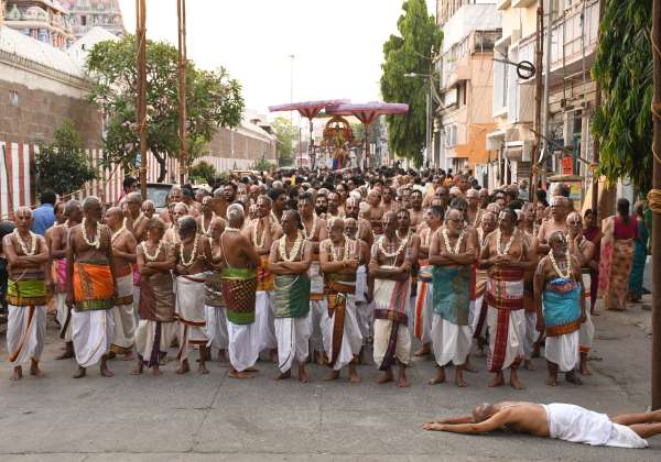 சென்னை திருவல்லிக்கேணி பார்த்தசாரதி பெருமாள் கோவில் பிரம்மோற்சவ விழாவில் மூன்றாம் நாளில் கருட வாகனத்தில் மாட வீதிகளில் உலா வந்த பார்த்தசாரதி.