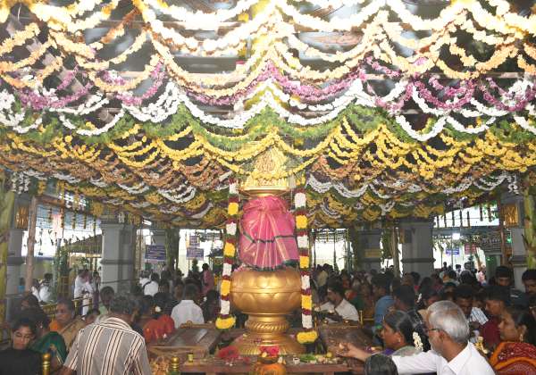 உடுமலை மாரியம்மன் கோவில் திருவிழாவில் இன்று நடக்கும் திருக்கல்யாணத்தையொட்டி மலர் அலங்காரம் செய்யப்பட்டுள்ளது.