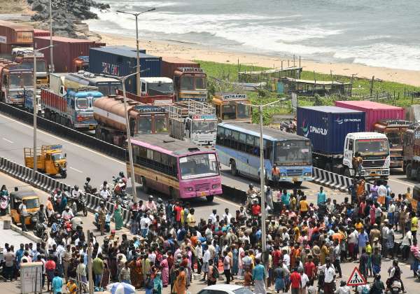 நகர்புற வாழ்விட மேம்பாட்டு வாரிய குடியிருப்புகள் கட்டி முடிக்கப்பட்டு வழங்கப்படாததால் மீனவர்கள் சாலை மறியலில் ஈடுபட்டனர். இடம்: எண்ணூர் விரைவு சாலை.