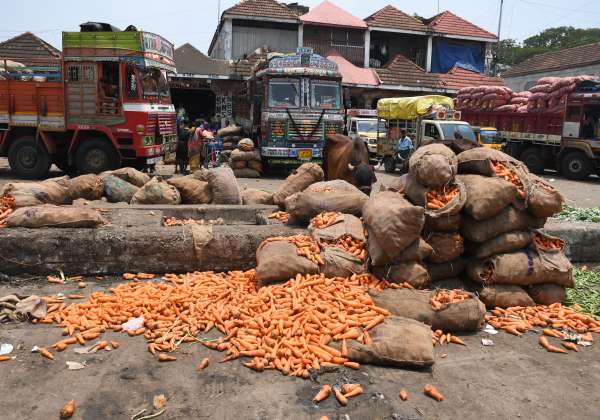 கோயம்பேடு மார்க்கெட்டில் விற்பனையாகாத கேரட் மூட்டை மூட்டையாக குப்பையில் கொட்டப்பட்டுள்ளன.