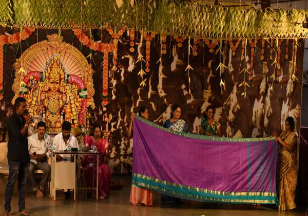 கோவை தண்டு மாரியம்மன் கோவிலில் அம்மனுக்கு சாட்டப்பட்ட பட்டு சேலைகள் ஏலம் விடப்பட்டது.