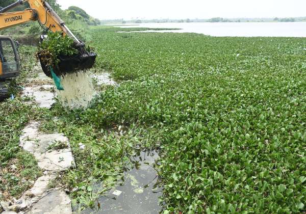 கோவை சிங்காநல்லூர் குளத்தில் ஆக்கிரமித்துள்ள ஆகாய தாமரை செடிகளை அகற்றும் பணி நடைபெற்று வருகிறது.