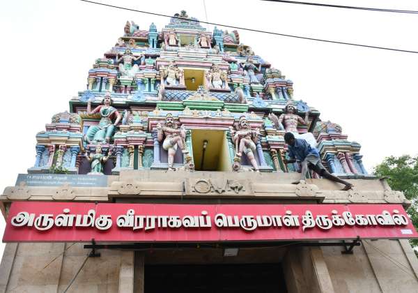 தினமலர் நாளிதழ் செய்தி எதிரொலியாக திருப்பூர், வீரராகவப் பெருமாள் கோவில் கோபுரத்தில் செடிகளை அகற்றி மீண்டும் வளராமல் இருக்க சிரிஞ்ச் மூலம் மருந்து அடிக்கும் பணி நடந்தது.