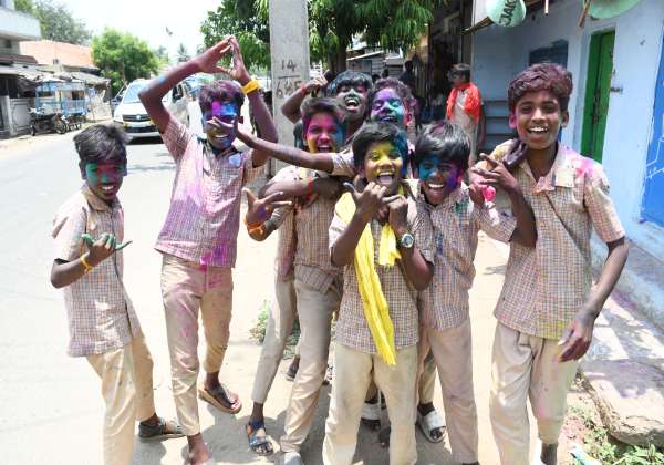 முழு ஆண்டு தேர்வு எழுதி முடித்த மாணவர்கள் முகத்தில் கலர் பொடி பூசி மகிழ்ச்சியை வெளிப்படுத்துகின்றனர்.இடம். உடுமலை அருகே கொமரலிங்கம்.