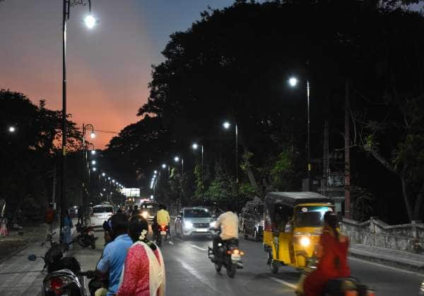 கடலூர் பழைய கலெக்டர் அலுவலகம் செல்லும் சாலை மின்னொளியில் ஜொலிக்கிறது.
