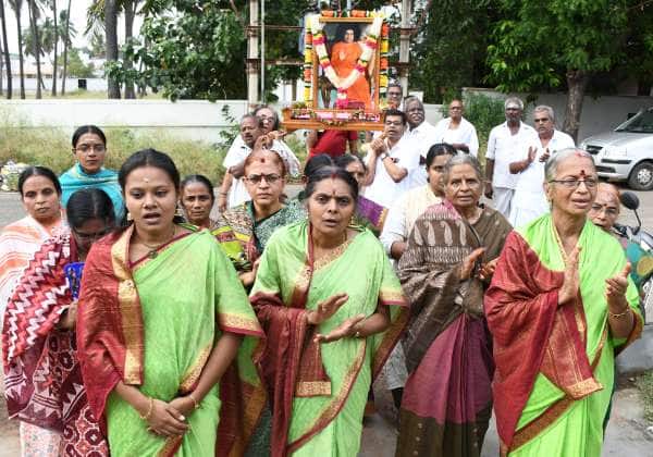 சத்ய சாய்பாபா ஸித்தி தினத்தை முன்னிட்டு பல்லக்கில் பூக்களால் அலங்கரிக்கப் பட்ட சாய்பாபா ஊர்வலத்தில் பக்தர்கள் பாடல்களை பாடி கொண்டு வந்தனர். இடம்.உடுமலை ஸ்ரீ சத்ய சாயி ஆன்மீக மையம்.