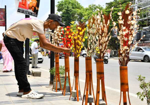 கோவை காந்திபுரத்தில் உள்ள கிராஸ்கட் பிளாட்பாரத்தில் விற்பனைக்கு வைக்கப்பட்டுள்ள பூச்செண்டு.