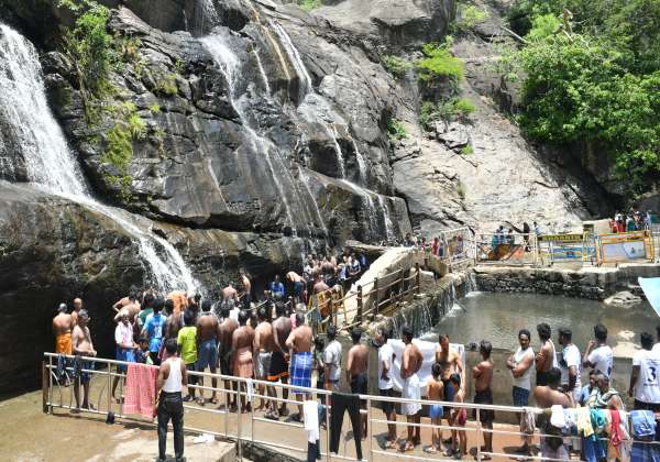 கோடை விடுமுறை துவங்கிய நிலையில் தென்காசி மாவட்டம் குற்றாலம் மெயின் அருவியில் குறைவாக விழுந்த தண்ணீரில் வரிசையில் காத்திருந்து குளித்த சுற்றுலா பயணிகள்.