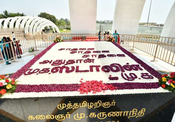 தி.மு.க., ஆட்சியின் நான்காண்டு சாதனைகள்யொட்டி சென்னை மெரினா கடற்கரையில் அமைந்துள்ள முன்னாள் முதல்வர் கருணாநிதியின் நினைவிடம் மலர்களால் அலங்கரிக்கப்பட்டுள்ளது.