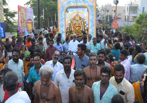 சித்திரை திருவிழாவை முன்னிட்டு வீரபாண்டி கோயில் வீட்டில் இருந்து கோயிலுக்கு ஊர்வலம் வந்த கவுமாரியம்மன்.