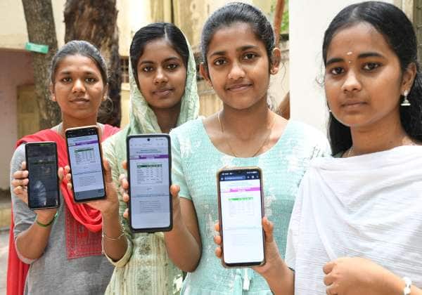 ப்ளஸ் 2 பொது தேர்வு முடிவுகளை மொபைலில் பார்த்த மாணவிகள். இடம்: கோவை அரசு கலைக் கல்லூரி.
