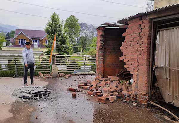 பாகிஸ்தான் தரப்பில் காஷ்மீரில் குடியிருப்பு பகுதிகளில் நடந்த தாக்குதலில் சேதமுற்ற கட்டடம்.