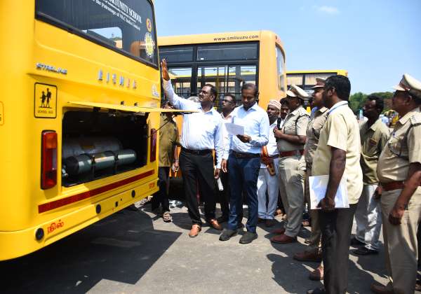 கடலூர் மஞ்சக்குப்பம் மைதானத்தில் மாவட்டத்தில் உள்ள தனியார் பள்ளி வாகனங்களை கலெக்டர் சிபி ஆதித்யா செந்தில்குமார் ஆய்வு செய்தார்.