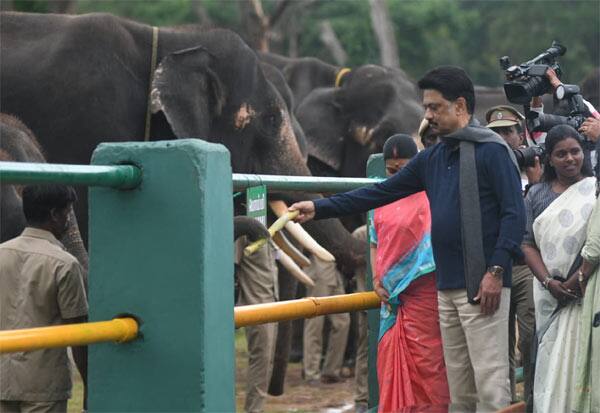 முதுமலை தெப்பக்காடு யானைகள் முகாமில் நடந்த விழாவில், 13 கோடி ரூபாய் மதிப்பிலான திட்டங்களை மாநில முதல்வர் ஸ்டாலின் துவக்கி வைத்து, வளர்ப்பு யானைகளை பார்வையிட்டு கரும்பு வழங்கினார்.