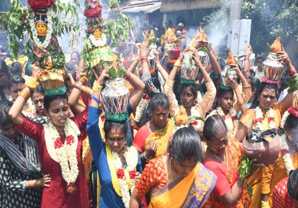 சித்திரை திருவிழாவை முன்னிட்டு அலங்கார மாரியம்மன் கோவிலுக்கு,கோவை நஞ்சுண்டாபுரம் சாலை சக்தி முனீஸ்வரர் கோவிலிருந்து சக்தி கரக ஊர்வலத்தில் பால்குடம் எடுத்து வந்த பக்தர்கள்.