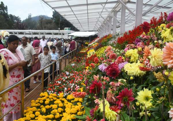 ஊட்டி தாவரவியல் பூங்கா, மலர் கண்காட்சியில், மாடத்தில் காட்சிக்கு வைக்கப்பட்ட மலர்களை ரசித்து செல்லும் சுற்றுலா பயணிகள் .