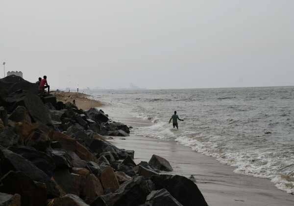 சென்னையில் வெயில் சுட்டெரித்த நிலையில் சட்டென மாறிய வானிலையால் கரு மேகங்கள் சூழ்ந்து ரம்மியாக லேசான சாரல் மழை பெய்தது. இடம் : மெரினா கடற்கரை, பட்டினப்பாக்கம்.