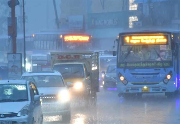 வெப்ப சலனம் காரணமாக இரவு நேரத்தில் இடியுடன் கூடிய பெய்த மழையில் செல்லும் வாகனங்கள் இடம் : கிரீன் சாலை, வேலூர்
