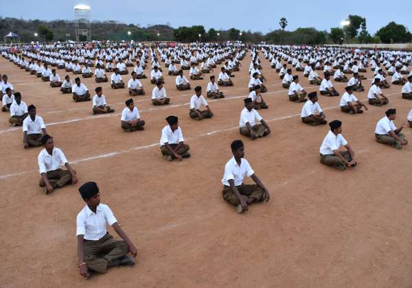 கோவைப்புதூர் ஸ்ரீ கிருஷ்ணா ஆதித்யா கலை அறிவியல் கல்லூரி வளாகத்தில் நடந்த ஆர்.எஸ்.எஸ்., பயிற்சி முகாமில் கலந்துகொண்ட இளைஞர்கள்.