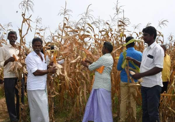 திருவள்ளூர் மாவட்டம் கும்மிடிப்பூண்டி வட்டத்திற்கு உட்பட்ட சேர்ப்பேடு கிராமத்தில் முதல்முறையாக பயிரிடப்பட்டுள்ள மக்காச்சோளத்தை ஆர்வத்துடன் பார்த்த விவசாயிகள்