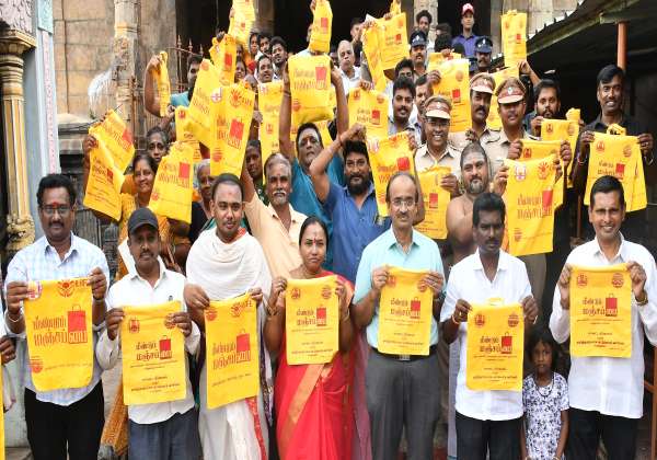 சென்னை மாநகராட்சி, மாசு கட்டுப்பாட்டு வாரியம் மற்றும் ஹிந்து அறநிலையத்துறை சார்பில் திருவொற்றியூர் தியாகராஜ வடிவுடையம்மன் கோவில் வளாகத்தில் துணிப்பைகள் உபயோகிப்பது குறித்து விழிப்புணர்வு ஏற்படுத்தினர்.