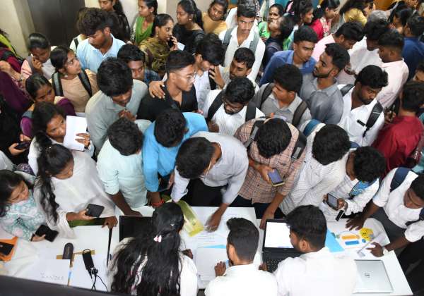 கோவை அவினாசி ரோட்டிலுள்ள இந்திய தொழில் வர்த்தக சபையில், நான் முதல்வன் திட்டத்தில் கீழ் கல்லூரி மாணவர்களுக்கான வேலை வாய்ப்பு முகாமில் கலந்து கொண்ட மாணவ, மாணவிகள்.