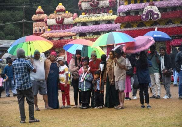 ஊட்டி தாவரவியல் பூங்கா, மலர் கண்காட்சிக்கு மழையிலும் வண்ண குடைகளுடன் வந்த சுற்றுலா பயணிகள்.