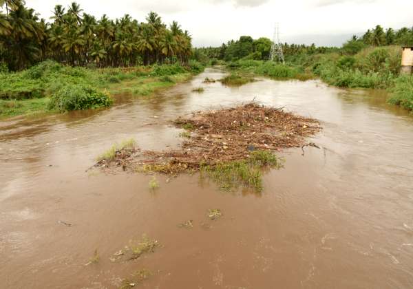 கோவை ஆலந்துறை அருகே உள்ள நொய்யல் ஆற்றில் ஆர்ப்பரித்து ஓடும் வெள்ளம்.