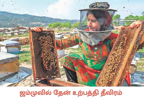 ஜம்முவின் புறநகர்ப் பகுதியில் ஓடும் தாவி ஆற்றின் அருகே அமைக்கப்பட்டு உள்ள தேனீ வளர்ப்பு மையத்தில், பெண் தொழிலாளர் ஒருவர் தேனீப் பெட்டிகளை ஆய்வு செய்தார். இப்பகுதியில் நிலவும் இதமான தட்பவெப்பநிலை மற்றும் பூத்துக் குலுங்கும் மலர்களால் தேன் உற்பத்தி அதிகரித்துள்ளது.