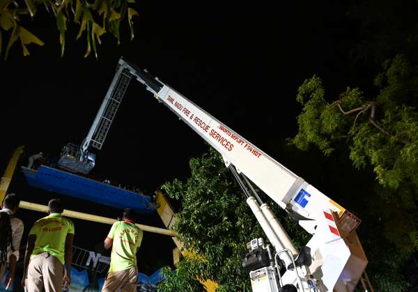 விஜிபி பொழுதுபோக்கு பூங்காவில் ராட்டினத்தில் சிக்கிய 26 நபர்களை தீயணைப்புத் துறையினர் ஸ்கை லிப்ட் மூலம் மீட்டனர்.இடம் : ஈஞ்சம்பாக்கம்.