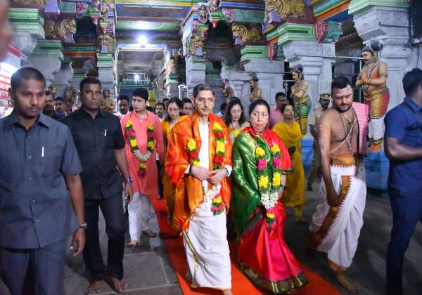 ராமேஸ்வரம் ராமநாதசுவாமி கோயிலில் தமிழக கவர்னர் ஆர்.என்.ரவி, மனைவியுடன் 22 தீர்த்தங்களில் புனித நீராடினார்.