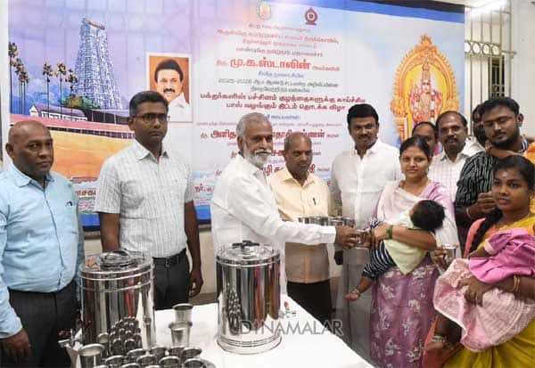 திருச்செந்தூர் முருகன் கோயிலில் பச்சிளம் குழந்தைக்கு காய்ச்சிய பால் வழங்கும் திட்டத்தை ஹிந்து அறநிலைய துறை அமைச்சர் சேகர்பாபு துவக்கி வைத்தார். அருகில் ஹிந்து அறநிலைய துறை கமிஷனர் பி.என்.ஸ்ரீதர், கூடுதல் ஆணையர் பழநி . திருச்செந்தூர் திருக்கோயில் தக்கார் அருள்முருகன்.