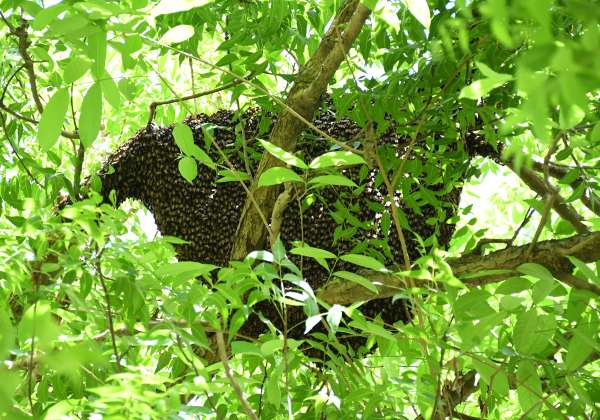 விழுப்புரம் - திருக்கோவிலூர் செல்லும் சாலையில் கானை அருகே சாலையோரம் உள்ள வேப்ப மரத்தில் மலை விஷ தேனீக்கள் கூடு கட்டி உள்ளது.