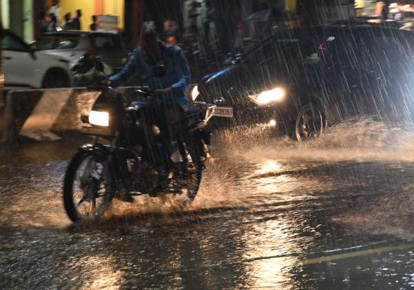 விழுப்புரத்தில் நேற்று இரவு பெய்த மழையில் ஊர்ந்து செல்லும் வாகனம்.
