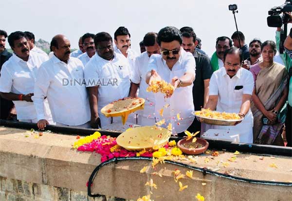 மேட்டூர் அணையில் இருந்து பாசனத்திற்காக தண்ணீர் திறந்து விடப்பட்டது. முதல்வர் ஸ்டாலின் மலர் தூவி தண்ணீர் மதகை திறந்து வைத்தார்.