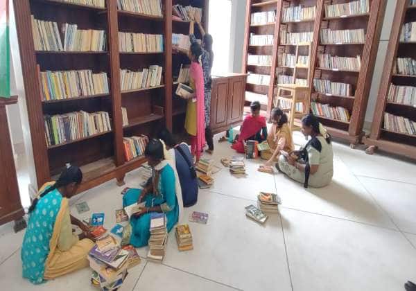 புதுச்சேரி கருவடிக்குப்பம் காமராஜர் மணி மண்டபத்தில் உள்ள நூலகத்தில் நூல்களைப் பற்றி அறிந்து கொள்ளும் விதமாக நூல்களை வாசிக்கும் பயிற்சியில் ஈடுபட்ட பாரதிதாசன் மகளிர் கல்லூரி மாணவிகள்.