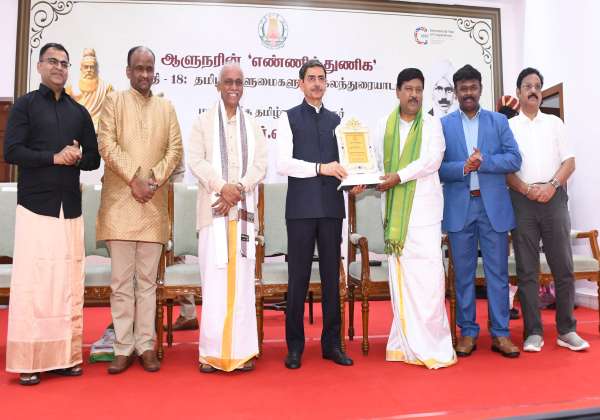 சென்னை கவர்னர் மாளிகை பாரதியார் மண்டபத்தில் தமிழ் அறிஞர்களுடன் கலந்துரையாடி பாராட்டி கவர்னர் ரவி, பேராசிரியர் ஞானசம்பந்தம் உள்ளிட்ட 18 பேருக்கு கேடயங்களை வழங்கினார்.