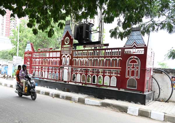 மின் பகிர்மான பெட்டிகளின் தடுப்புகளில் மாநகராட்சி சார்பில் வரையப்பட்டுள்ள வண்ண ஓவியம். இடம் : பெரம்பூர்