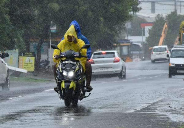 சாரல் மழையில் ஊர்ந்து சென்ற வாகனங்கள். இடம்: கோவை, மதுக்கரை மார்க்கெட் மெயின் ரோடு.