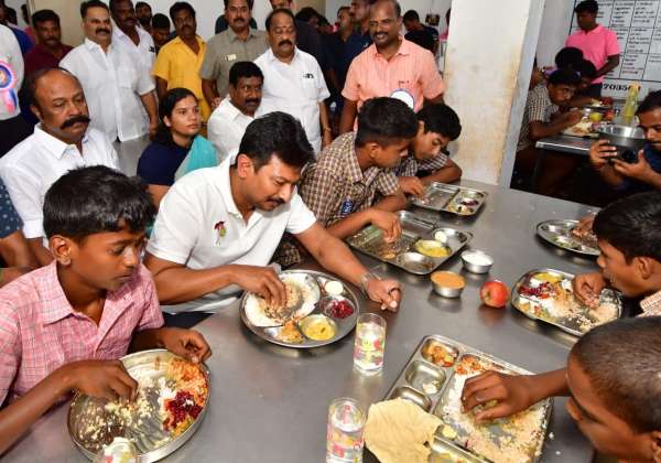 சிவகங்கை மாவட்ட விளையாட்டு மைதானத்தில் விளையாட்டு வீரர்கள் விடுதியில் மாணவர்களுடன் உணவு அருந்திய துணை முதல்வர் உதயநிதி